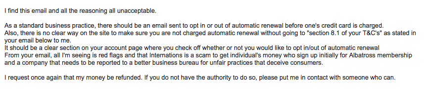 I have spoken to other expats in the Paris area who have had the same problem and all complained to Internations with the same issue, so I know for a fact that "Many members view this feature positively, as it saves them the hassle of renewing their Albatross Membership manually." is complete BS and that the information was not clearly displayed or so many of us would not have run into this issue. Not sure what legitimate companies really function on automatic renewal without checking a box saying "i wish to be set up for auto-renewal". Also, think it is pretty shady to cite "please refer to as stated in section 8.1" several times in an email. The email sent to me was obviously a template drafted up by their ambulance chaser legal team to send to the the many people who have encountered (and will encounter) this problem.